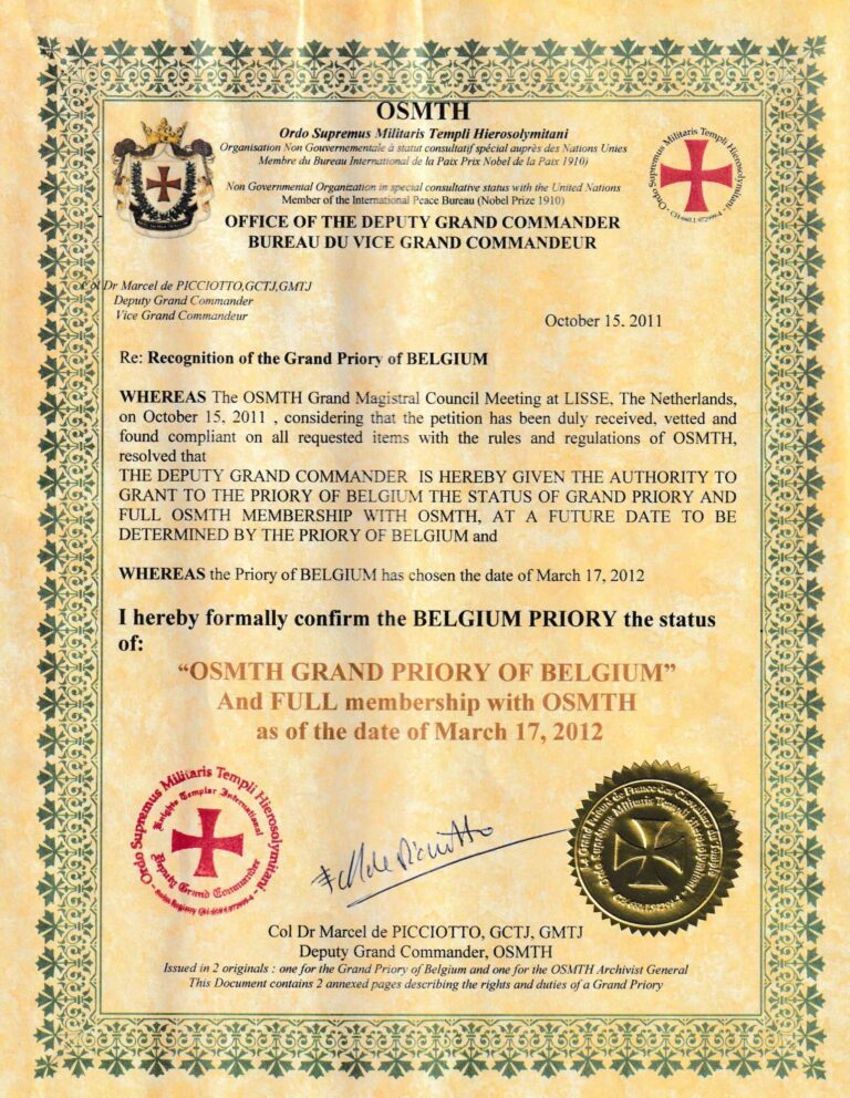 Welkom op de officiële website van OSMTH België. Het is ons een eer u te mogen verwelkomen en een blik te bieden in onze Orde en haar missie. Als Ridderorde in de christelijke traditie laten wij ons inspireren door het erfgoed van de Tempeliers — een erfenis van trouw, moed, rechtvaardigheid en dienstbaarheid. Dit eeuwenoude kompas draagt ons vandaag nog steeds in onze inzet voor een vreedzame en waardige wereld.